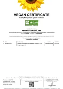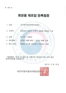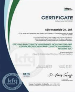 全球證書 創業認證 一月,2021 企業附屬研究研究所認證 十二月,2020 化妝品製造商認證 一月,2022 EVE-Vegan(法國) 七月,2022 四月,2022 ISO 9001 認證 九月,2022 ISO 14001 認證 九月,2022 2023 年 8 月 2024 年 1 月 EFfCI (European Federation for Cosmetic Ingredients GMP): year 2024 Cheonan 55項專利 25篇國際期刊 cGMP EFfCl